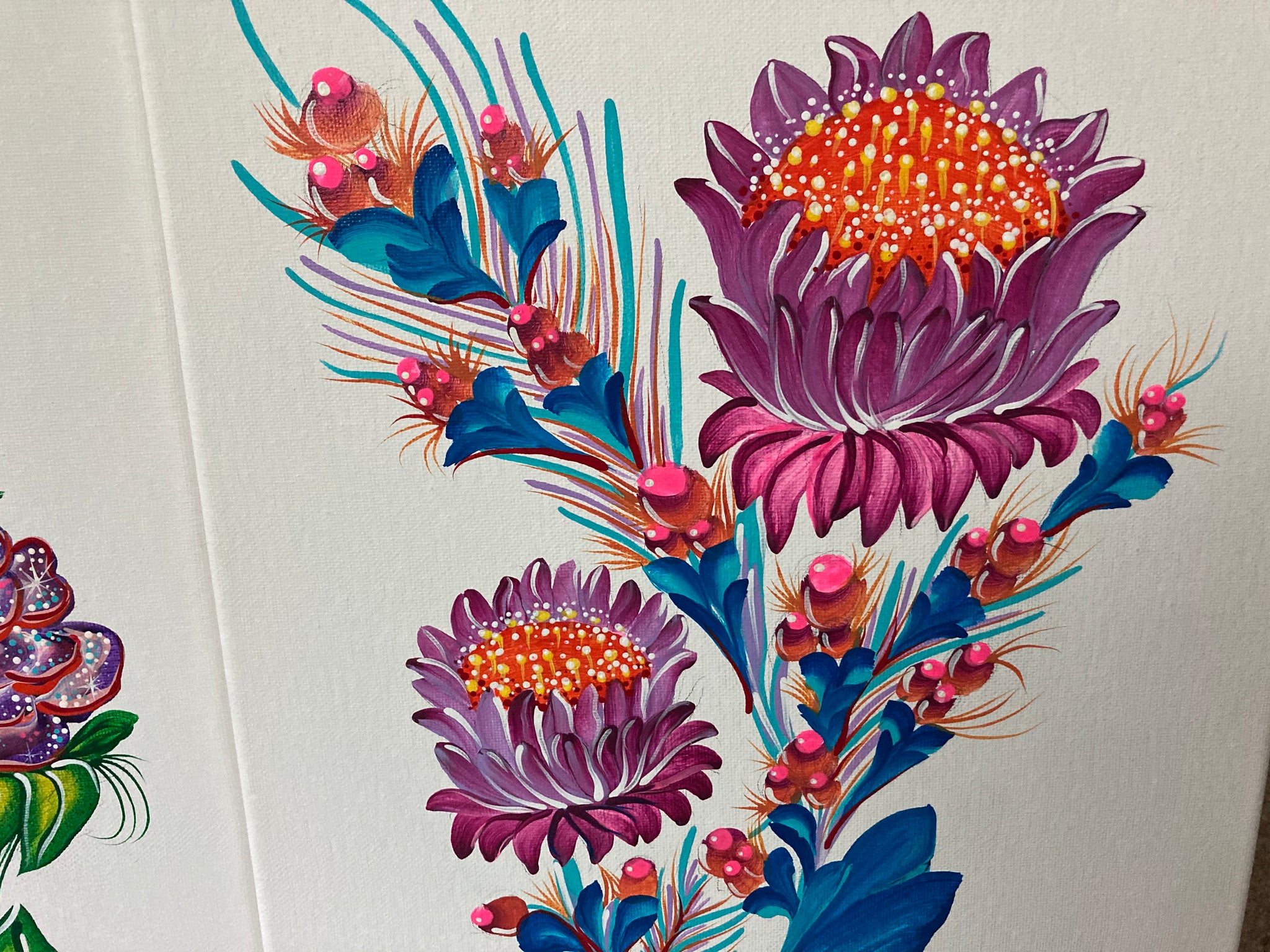 Skillfully drawn and painted by artist and educator Rhiannon (Annie) Morgan. The glow of the flower is rendered with bold colors, indicating a warm spirit of love, dare I say Fiery in its intensity. The universal soul and strength of the feminine is achieved with this work, as well as with its sister piece "Fierce Flowers ~1". The blue stems and growing berries are playful and as beautiful as pearls, shining with painted light. These flowers are ferocious as well as beautiful, unique and hardcore, a testimony to the enduring spirit of artists and women who have paved their own way. The background canvas is left raw, appropriate as the central image is so inspired. Acrylic on canvas. Size: 11" x 14"