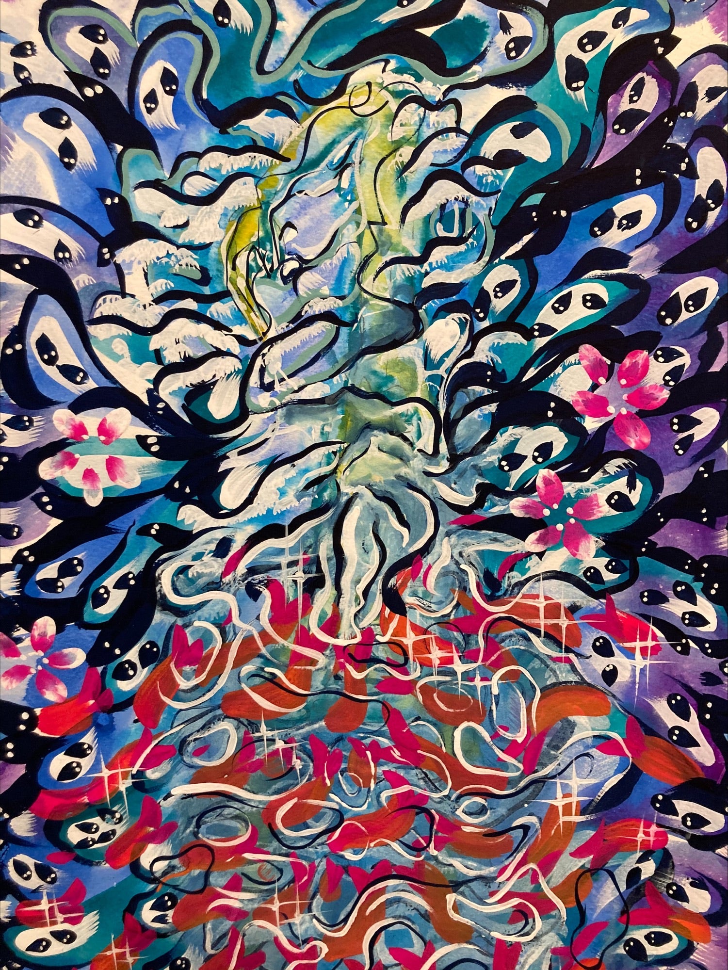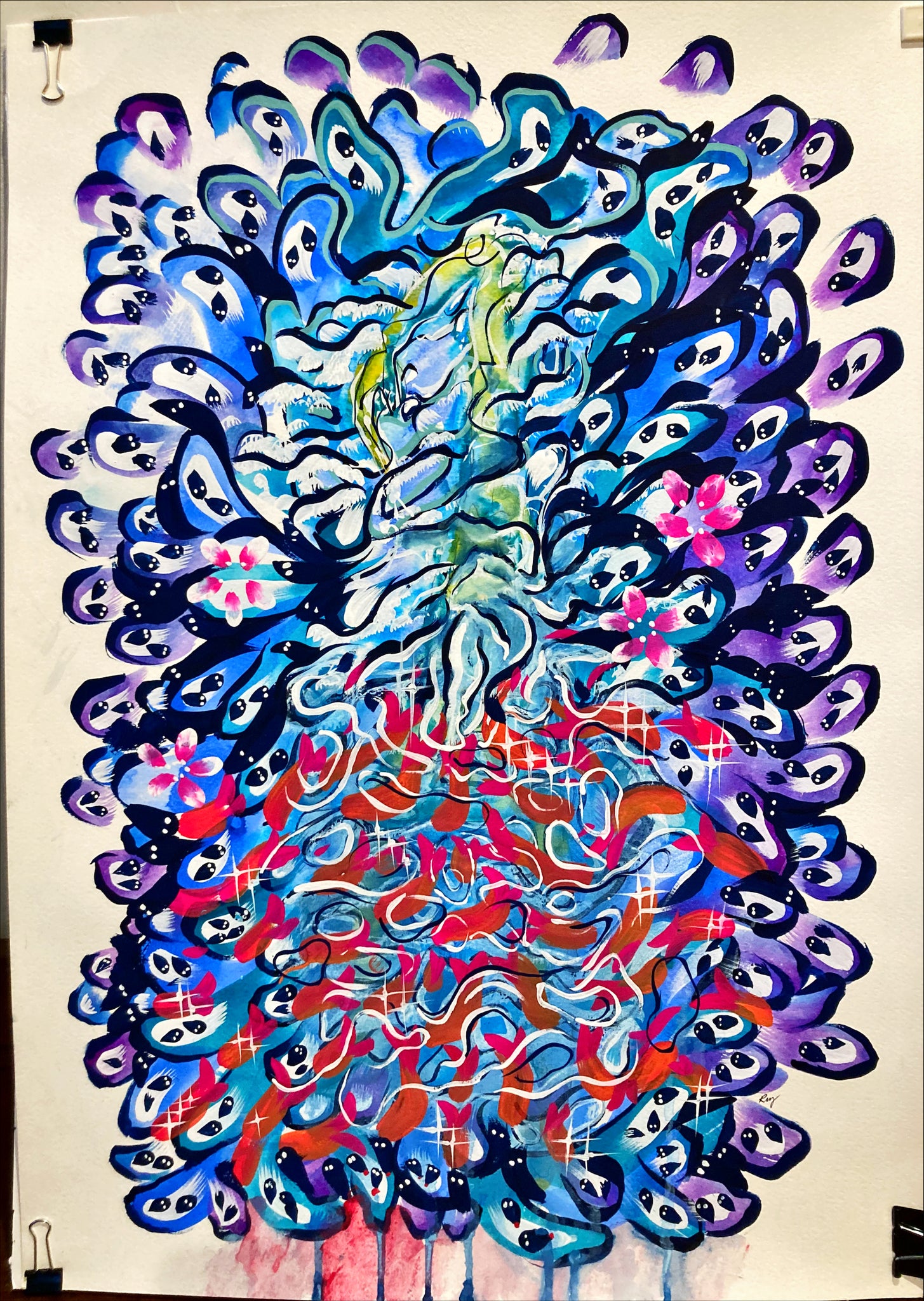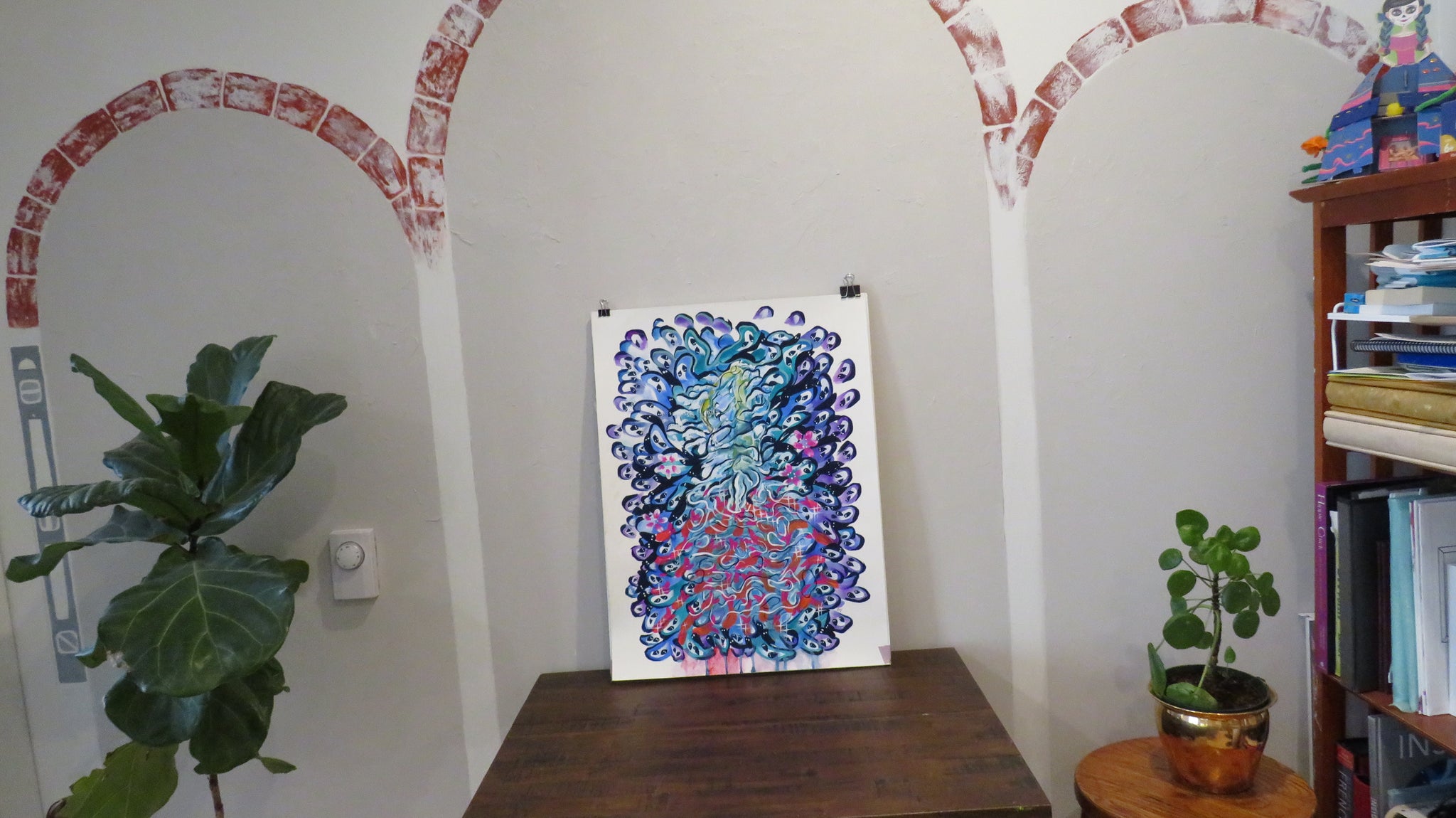 I was quite taken by this gouache piece by my friend Annie Morgan AKA Muktiji, along with its sister piece (lady underwater) and shuttled them from the East coast to the West coast, strengthened and enwombed in hard tubes to protect them. I often say, "this is a piece by my tattooed raver friend - she is really onto something in her recent work." Because the details appear dainty and are so lovely; but they are fierce and opinionated. They embody the utmost feminine spirit of grace against friction, difficulty, opposition, struggle... and then there is balance.