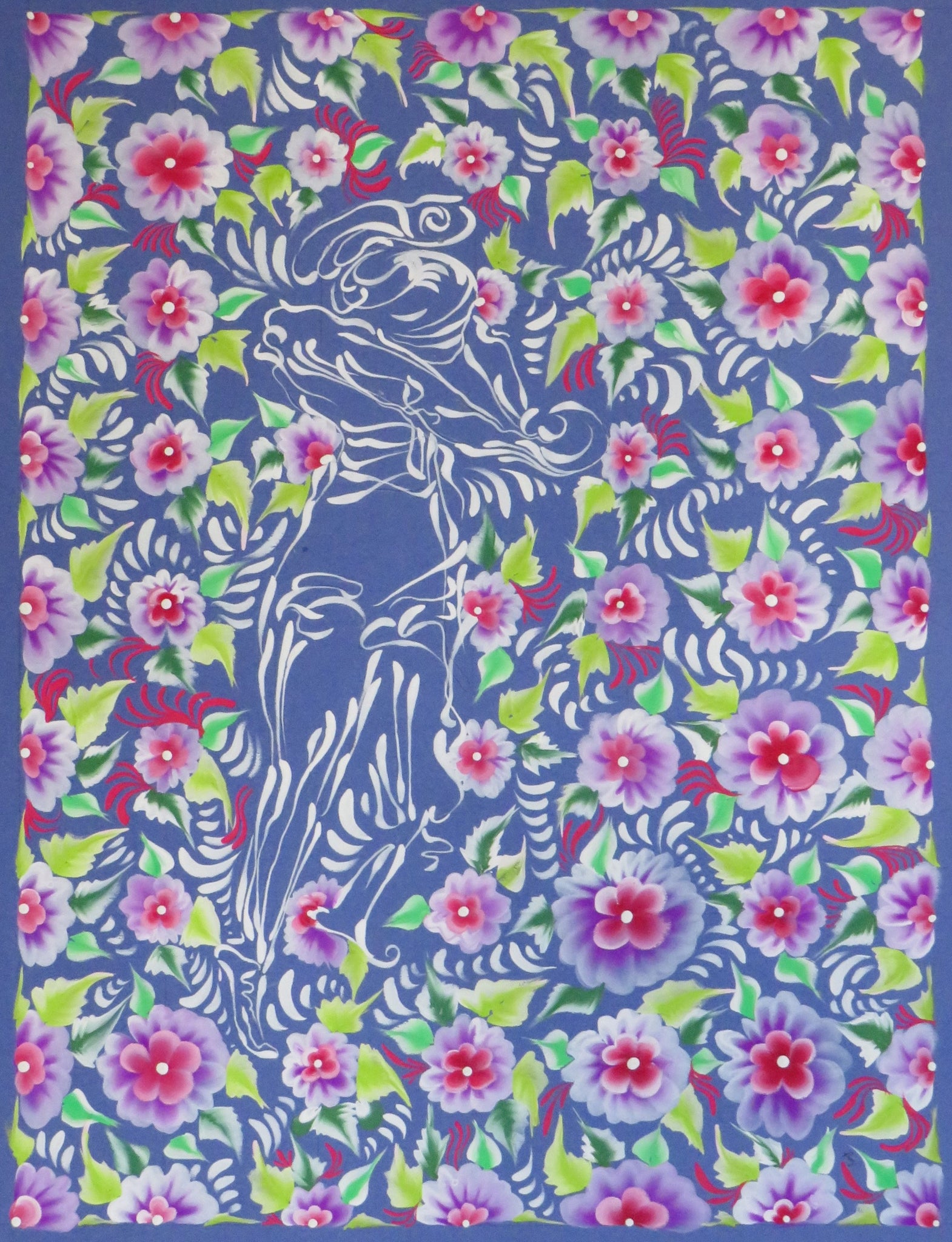 The central nude figure is drawn with fluid lines, holding the floral pattern in place as they surround it with their puffy softness. The flowers are created with gouache, a medium with which the artist has developed a gorgeous technique over the years.