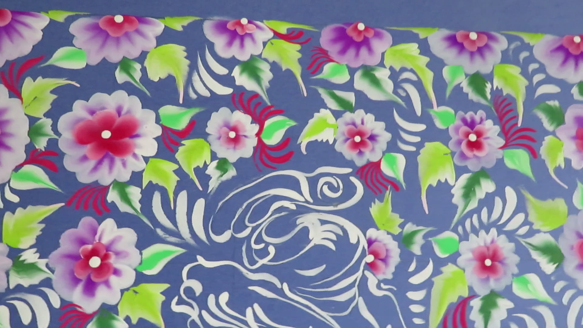 I'm enamored with Annie's floral patterns. This work and its sister panel exhibit a balance of classic and techno, with a dose of surfer aesthetic.