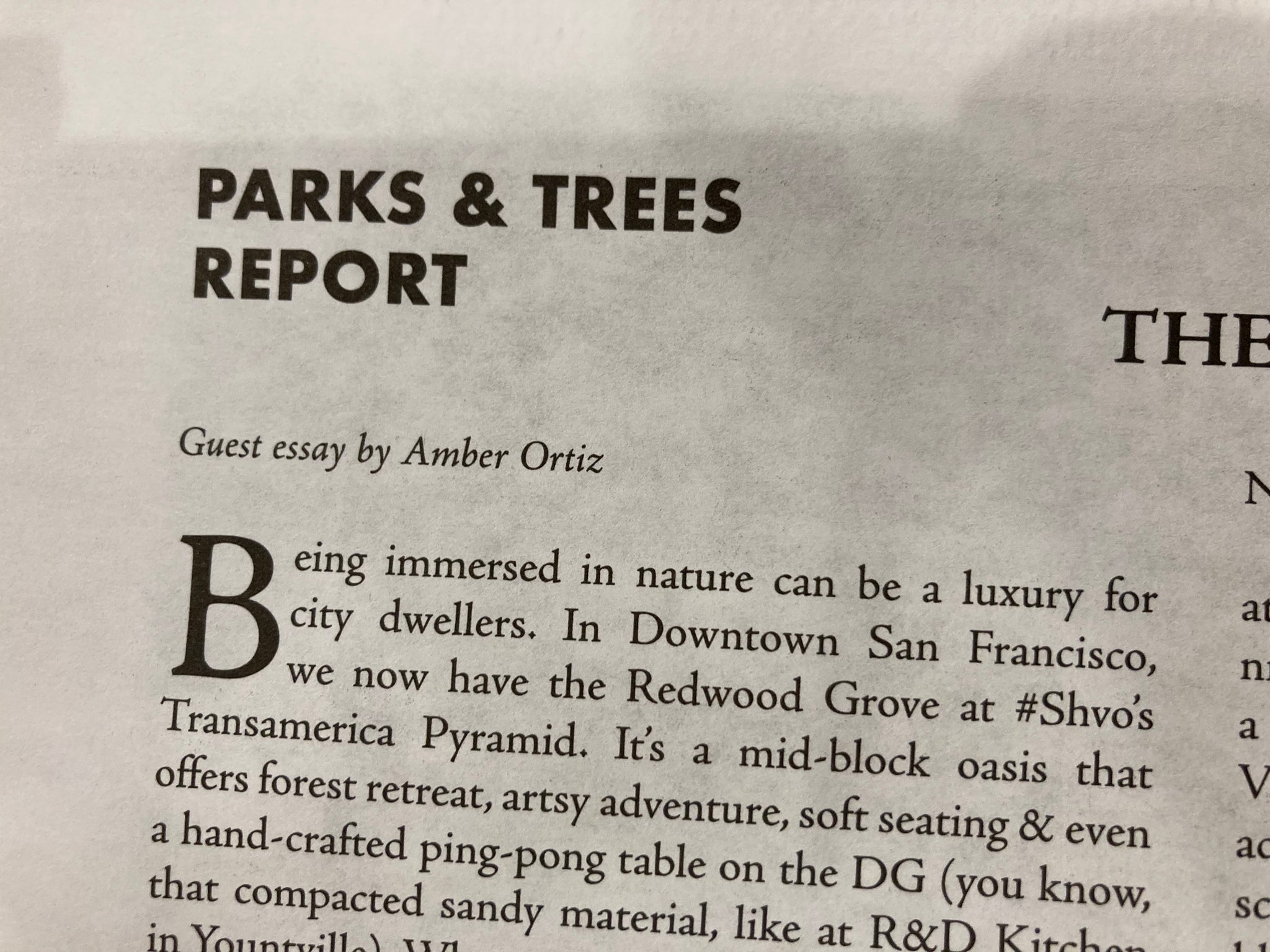 Being immersed in nature can be a luxury for city dwellers. In Downtown San Francisco, we now have the Redwood Grove at Shvo's Transamerica. It's a mid-block oasis that offers forest retreat, artsy adventure, soft seating & even a hand-crafted ping-pong table on the DG (you know, that compacted sandy material, like at R&D Kitchen in Yountville). When you play ping-pong on it, you feel nature under your shoes.