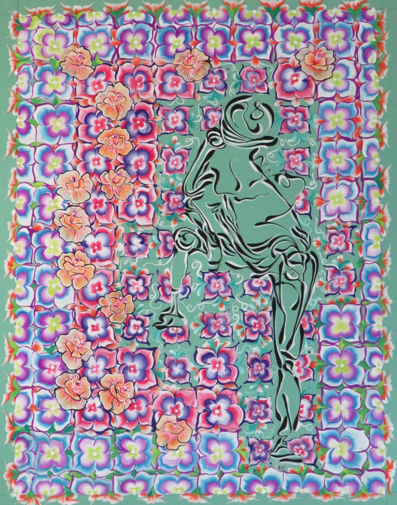 The eyes have options and start seeing the handful of flower types. The central nude figure is drawn with fluid lines, holding the floral pattern in place or interrupting it - however one chooses to interpret it.